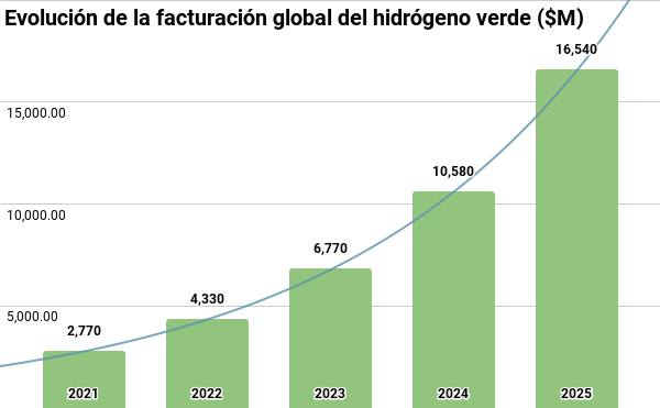 Los últimos estudios indican un crecimiento de la facturación del sector del 56% anual, postulando al hidrógeno verde como principal alternativa al gas. Esta energía renovable es una gran candidata gracias a su bajo impacto medioambiental, su facilidad de almacenamiento y su gran inversión por parte de las grandes instituciones mundiales.