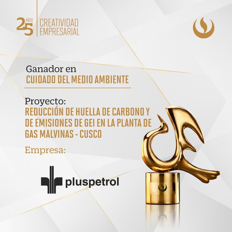 Lima, noviembre de 2021.- Pluspetrol, operador de Camisea, obtuvo el Premio Creatividad Empresarial por su proyecto Reducción de huella de carbono y de emisión de Gases Efecto Invernadero (GEI) en la Planta de Gas Malvinas – Cusco, el cual ejecuta desde el año 2012 y por el que se deja de emitir anualmente 51,000 toneladas de CO2, contribuyendo así con los compromisos asumidos por el país para afrontar al cambio climático.